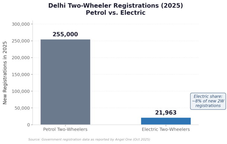 Delhi’s air quality crisis is well documented. A recent report by the Commission for Air Quality Management (CAQM), submitted to the Supreme Court of India, identified vehicular emissions as the single largest contributor to air pollution in Delhi, accounting for approximately 23% of winter pollution. Two-wheelers alone constitute roughly 67% of the city’s total registered vehicle stock, making their electrification a high-priority target.