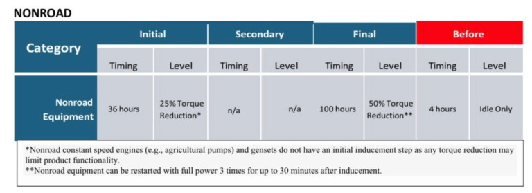 Under current policy, heavy-duty trucks will receive a warning light for up to 650 miles or 10 hours after a fault is detected. Mild derates may follow, but vehicles can operate without speed limits for up to 4,200 miles or roughly two work weeks. Only after about four weeks does speed drop to 25 mph until repairs are made. Nonroad equipment faces no impact for the first 36 hours after a fault (see table).